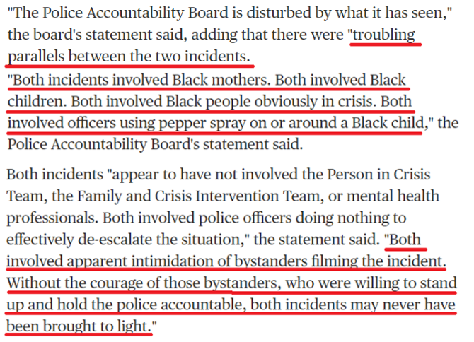 在罗切斯特市民间组织“警察问责委员会”(PAB)看来,这起事件和最新发生的事件存在“令人不安的相似之处”:都涉及非洲裔母亲和儿童;都涉及明显处于危机中的非洲裔美国人;都涉及警察对非洲裔母亲和儿童使用胡椒喷雾。在这两起事件中,警察都没有采取任何措施来缓解事态,而且都有明显的恐吓旁观者的行为。“如果没有这些旁观者的勇气,这两起事件可能永远不会曝光。”