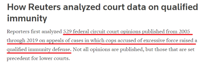 根据“有限豁免权”,如果不能追溯到涉事警察此前存在和被起诉行为相同的行为,那么即使已经侵犯到他人的权利,被起诉警察也不用承担任何责任。根据路透社对美国2005年至2019年期间数百起滥用武力案件上诉结果的分析,美国法院越来越倾向于通过“有限豁免权”来保护警察。