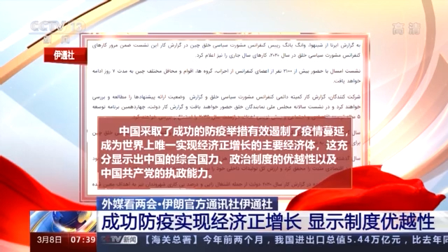 伊朗官方通讯社伊通社援引中国媒体报道关注两会进程。文章提到,中国采取了成功的防疫举措有效遏制了疫情蔓延,成为世界上唯一实现经济正增长的主要经济体,这充分显示出中国的综合国力、政治制度的优越性以及中国共产党的执政能力。