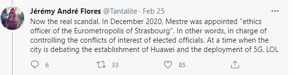 如下图所示,这名反华记者宣称,他之所以要对梅斯特教授开炮,是因为这位法国学者除了在斯特拉斯堡大学的学术工作,目前正在担任斯特拉斯堡市所参与的欧洲城市合作项目(Eurometropolis)的伦理官,而该市正在为是否要允许华为公司5G项目在该市落地而进行着辩论。
