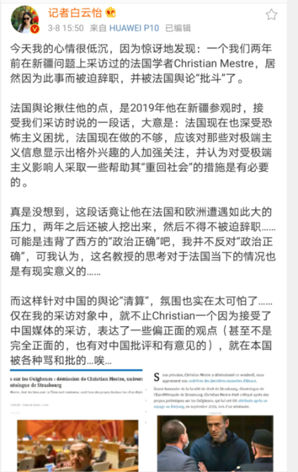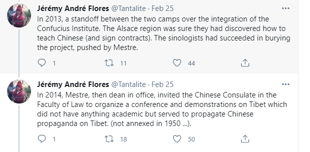 另外,这名反华记者还将梅斯特教授此前在斯特拉斯堡大学里推动发展与中国的学术合作,欢迎孔子学院来该校办学,受邀参加过中国大使馆在当地举行的西藏活动,以及在此次新冠疫情期间发表的肯定中国防疫措施的言行,也都作为了攻击梅斯特教授的“黑材料”。