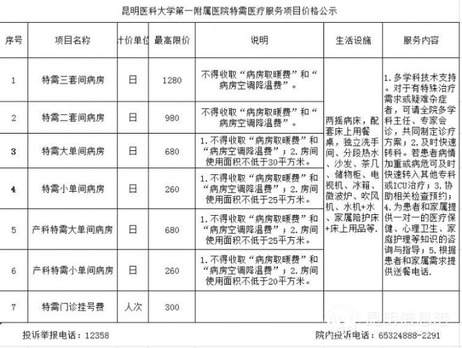 在云大医院官网“医疗收费价格公示”版块,有一份发布于2018年7月的《昆明医科大学第一附属医院特需医疗服务项目价格公示》,其中显示特需门诊挂号费每人次300元;另外一份公示《云南省非营利性医疗服务价格》显示普通门诊诊查费每次5元,主任医师每次15元,副主任医师每次10元。
