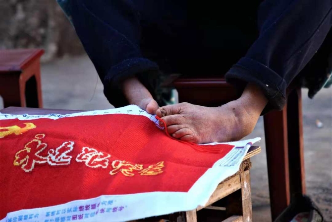 死了娃娃可怜,两口子哭完,咬咬牙还得干。张顺东说,别人掉几颗汗珠能干完的活,我们得湿几层衣裳、多磨出几个血泡才行。天刚亮俩人就下地了,种玉米张顺东在前面刨坑,李国秀后面下种;收玉米丈夫在前面掰,妻子背着篓在后面接。在娘家没切过菜的李国秀,练起了双脚基本功。慢慢的,她双脚能切菜、能绣花、能下种:双脚穿针引线,绣出的花像真的;芝麻粒大小的菜籽,她能用脚趾夹起来。