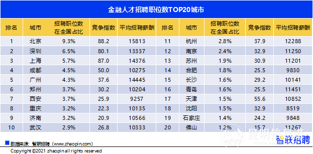 整体来看,我国金融人才招聘需求地域分布较为均匀,在招聘需求最高的20个城市中,北京占到9.3%,深圳与上海分别以6.5%、5.7%紧随其后。成都跻身人才需求第四名,领先广州0.2个百分点。