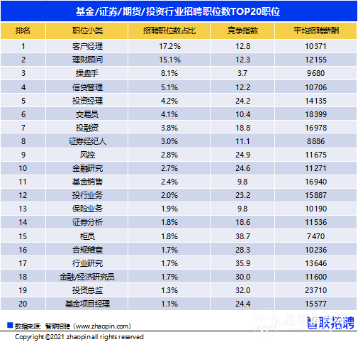 智联招聘近日发布《2021年金融业求职指南》,聚焦银行业、证券业、保险业、信托业四大细分领域主要业务岗位的人才供需状况、薪酬水平、企业招聘要求等。其中指出,基金、信托业的高薪光环吸引人才涌入,2020年股市基金热推动操盘手人才需求上涨33.3%,银行业数字化转型势头强劲,对数据、AI(人工智能)人才需求环比分别增长1.6、1.3倍。