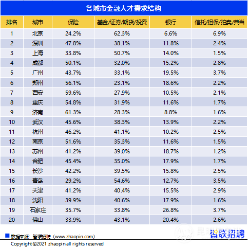 在金融人才招聘需求前20名城市中,北京、上海的金融人才需求中基金/证券/期货/投资行业占比最高,分别达到62.3%和50.7%,而以深圳、成都、广州为首的多数城市,招聘更多的是保险业人才。在银行业人才需求规模上,广州、郑州、合肥、沈阳有着相对更高的占比。