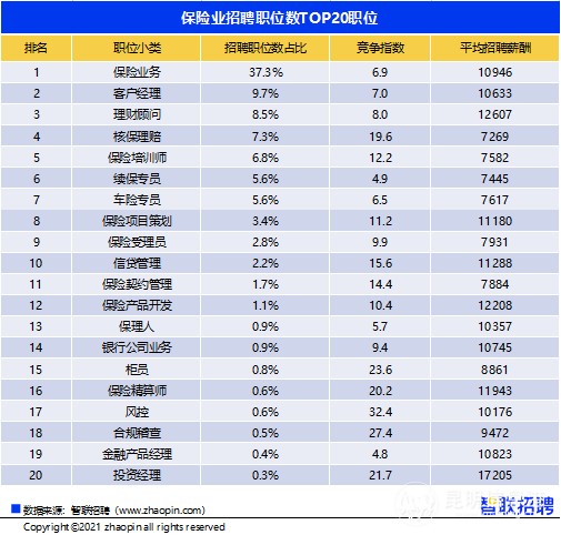 统计周期内,保险业务人才招聘需求占到37.3%,其次是客户经理(9.7%)和理财顾问(8.5%)。竞争热度适中、薪酬较高的岗位,有保险项目策划和保险产品开发,这两个岗位分别对项目经验和技术能力有所侧重,形成一定竞争壁垒。