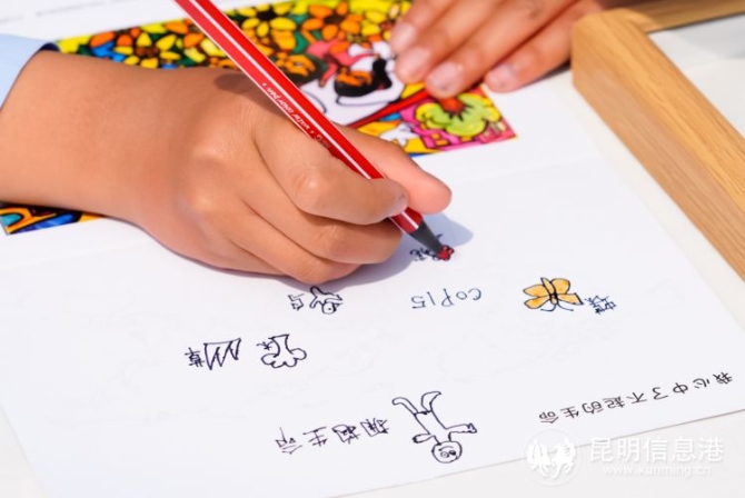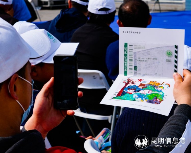 上午十点,来自云南大学附属中学一二一小学部、云南师范大学附属小学呈贡校区等学校的小朋友们在活动现场写下“春城之邀”明信片,卡纸上的图片选自昆明市2020年“生物多样性保护”环保公益海报征集大赛中小朋友们的优秀作品——蓝天白云、青山绿水、虫鱼鸟兽......每一张都充满孩童的想象力与灵气,作品另一面的留白处则留给小朋友们尽情发挥。卡纸里夹着一张透明的“机票”,上面印着——出发地:昆明 时间:2021 航班:COP15。透明“机票”还是一个小小的相框,可以框住一张灿烂的笑脸、框住昆明的蓝天白云、框住可爱的红嘴鸥。