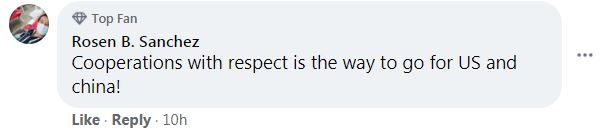 名为“Rosen B. Sanchez”的网友在新华社“脸书”账号贴文下回复:“对于中国和美国来说,合作和尊重才是正确的道路!”