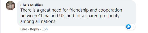 名为“Chris Mullins”的网友同样在“脸书”上留言说:“中美之间需要友谊和合作,所有国家的共同繁荣也有赖于友谊和合作。”