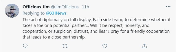名为“Officious Jim”的网友在新华社推文下回复说:“外交的艺术得到了充分展现。双方都在试图判断对方是敌人还是伙伴。选择尊重、诚实以及合作,还是怀疑、不信任以及谎言?我祈祷(中美)能展开友好合作,并最终达成紧密的伙伴关系。”