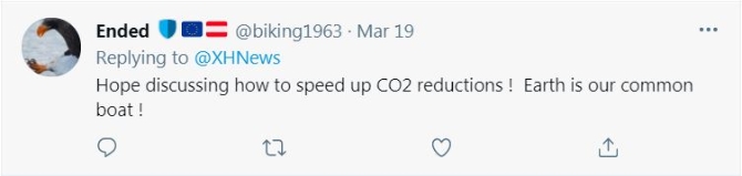 名为“Ended”的网友对中美加强气候变化领域对话合作很期待:“希望双方讨论了如何加速降低碳排放!我们都在地球这一条船上!”