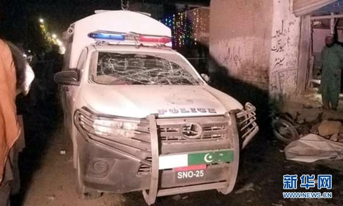 3月23日,在巴基斯坦俾路支省杰曼,一辆警车在爆炸中受损。新华社发