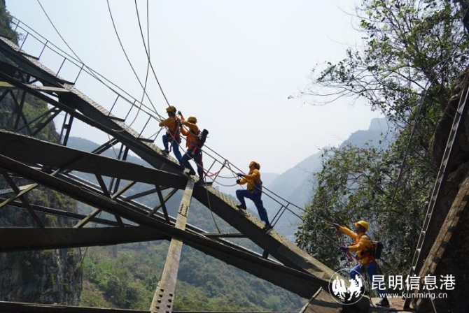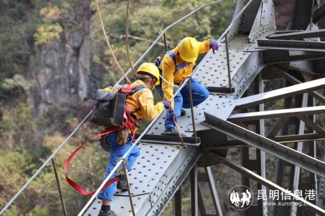 峡谷的风吹得悬崖上的树枝飘摇,树叶“刷刷”作响。脚下百米处,南溪河的一级支流——四岔河“哗哗”流淌。旁人看来的美景,对攀爬在桥上的职工来说,却是一种极大的心理考验。