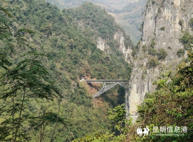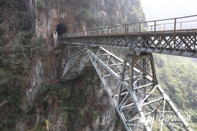 世界闻名的人字桥位于百年米轨滇越铁路波度箐站与倮姑站之间,桥两侧是200米高的悬崖峭壁,隧-桥-隧相连,桥面与谷底南溪河支流——四岔河相距100多米。从远处看,这座巧夺天工的人字桥仿佛一个钢铁巨人,飞跨于两山绝壁之上。一百年来,默默承托起滇越铁路来来往往的列车,为云南的政治经济发展作出重要贡献。至今每天还有两对中越国际联运列车运营。