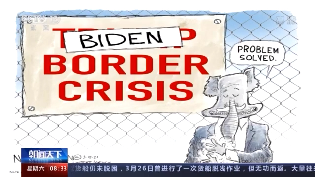 美国《一周》周刊网站近日刊登的一幅漫画就嘲弄了民主、共和两党的相互“甩锅”之举。画面中,美墨边境墙铁丝网上挂着一块牌子,把“特朗普边境危机”字样改写成“拜登边境危机”,而站在铁丝网后代表共和党的一头大象开心地表示,“问题解决了。”