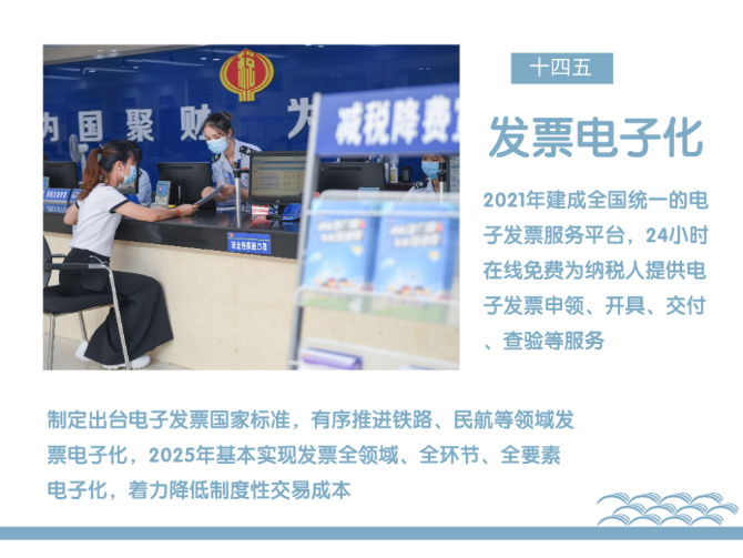 根据意见,我国将稳步实施发票电子化改革。2021年建成全国统一的电子发票服务平台,24小时在线免费为纳税人提供电子发票申领、开具、交付、查验等服务。制定出台电子发票国家标准,有序推进铁路、民航等领域发票电子化,2025年基本实现发票全领域、全环节、全要素电子化,着力降低制度性交易成本。
