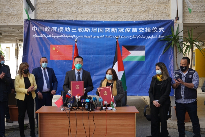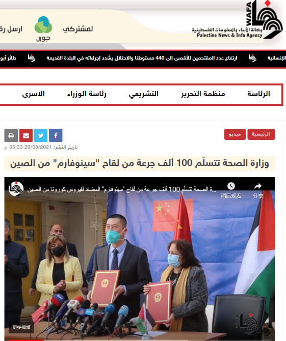 据中国驻巴勒斯坦办事处网站消息,3月29日,中国政府援助巴勒斯坦国药新冠疫苗运抵拉马拉。驻巴勒斯坦办事处主任郭伟、巴卫生部长凯莱共同出席在巴卫生部举行的疫苗交接仪式。