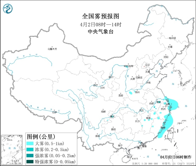 预计,4月2日上午,浙江沿岸海域、福建沿岸海域、长江口、舟山群岛附近海域、东海西北部部分海域将有能见度不足1公里的大雾。中央气象台4月2日06时继续发布大雾黄色预警(见图1)。