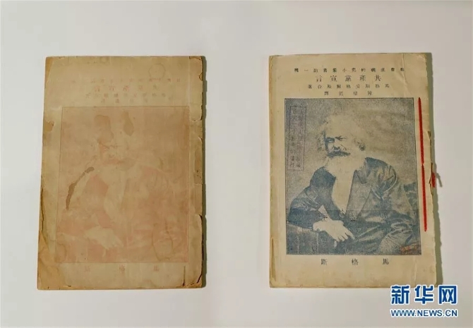 在中共一大会址纪念馆拍摄的1920年8月(左)和9月出版的《共产党宣言》中文全译本。新华社记者 刘颖 摄
