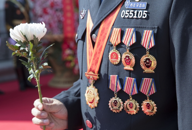 ↑2020年9月19日,在抗美援朝纪念馆英烈厅,志愿军老战士和少先队员向牺牲的烈士致敬。新华社记者 杨青 摄