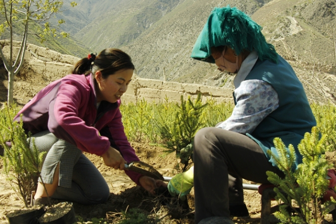 ↑全国脱贫攻坚楷模张小娟(左)生前工作照(资料照片)。新华社发