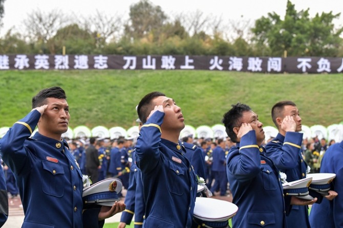 ↑2019年4月4日,参加四川木里森林火灾扑救中英勇牺牲烈士悼念活动的森林消防官兵向牺牲的战友敬礼。在这场火灾中,共有27名森林消防队员牺牲。新华社记者 张超群 摄