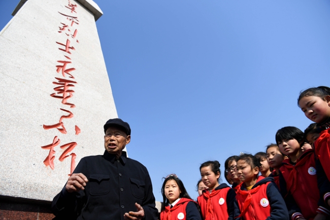 ↑今年89岁的胡兆伦是安徽省怀远县陈集镇胡刘烈士陵园管理员,70多年如一日为英烈们守墓。这是他在烈士陵园为前来扫墓的小学生讲解烈士的事迹(2019年3月14日摄)。新华社记者刘军喜摄
