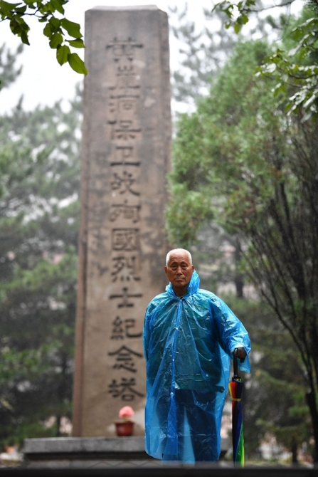 ↑76岁的赵乃堂是山西省黎城县黄崖洞烈士陵园的守墓人,守护英烈30年。这是2018年9月18日,在黄崖洞烈士陵园,赵乃堂站在黄崖洞保卫战殉国烈士纪念塔前。新华社记者 詹彦 摄