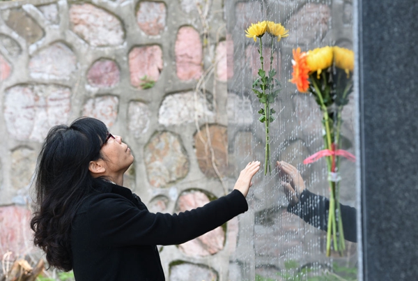 ↑2017年4月1日,抗日航空烈士汤卜生的孙女汤伟华在南京抗日航空烈士纪念碑广场上刻有汤卜生名字的纪念碑上粘贴菊花。新华社记者孙参摄