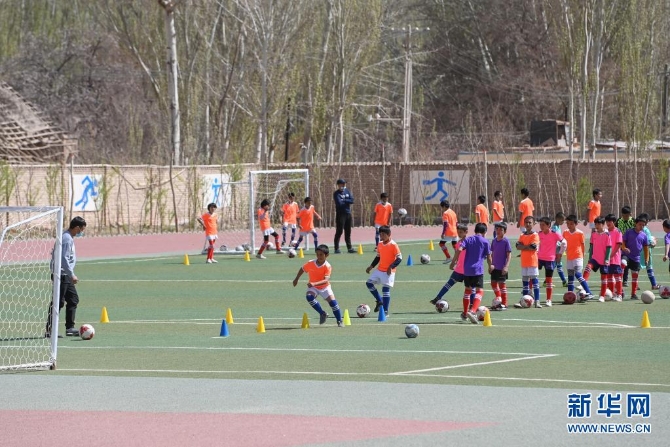 在新疆喀什市阿瓦提乡中心小学,学生们在足球场上练习(3月31日摄)。新华社记者 丁磊 摄