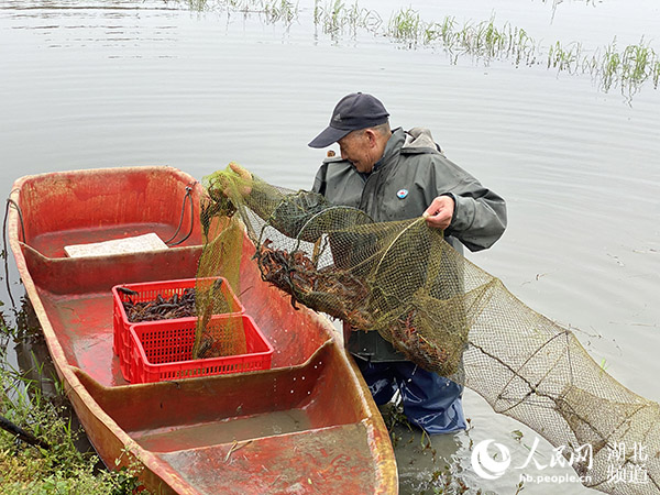 湖北潜江,虾农正在捕虾。人民网 张沛摄