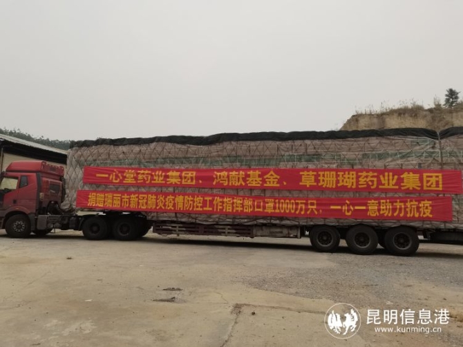 昆明信息港讯 记者合宇聪 记者从一心堂药业集团获悉,4月5日,一心堂药业集团、江西草珊瑚药业、鸿献基金三方共同捐赠1000万只口罩运抵瑞丽。