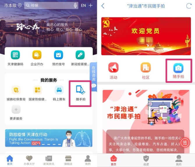 津云新闻讯:近日,“津心办”“津治通”“两津联动”全场景应用再上新,新添“市民随手拍”功能,进一步激发群众参与社会治理的活力。从现在开始,市民在全市任何地方只要发现问题,就可以打开“津心办”APP中的“随手拍”模块,将问题拍照定位上报,只需30秒,您关心的“这件事”即可推送至“津治通”,进入事件流转处理程序。随着“两津联动”应用场景不断丰富,政务服务“一张网”和城市治理“一张网”在“指尖”合一,驱动数据价值不断释放,赋能城市数字化转型,不断满足群众对美好生活的新期待,共建共治共享“我的城”。
