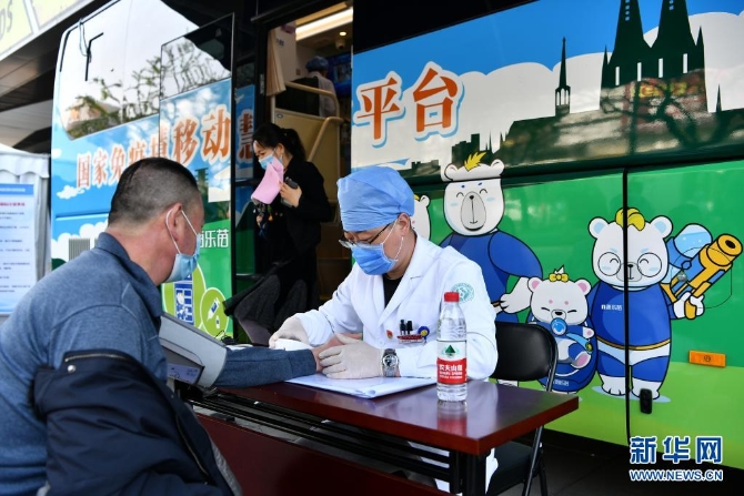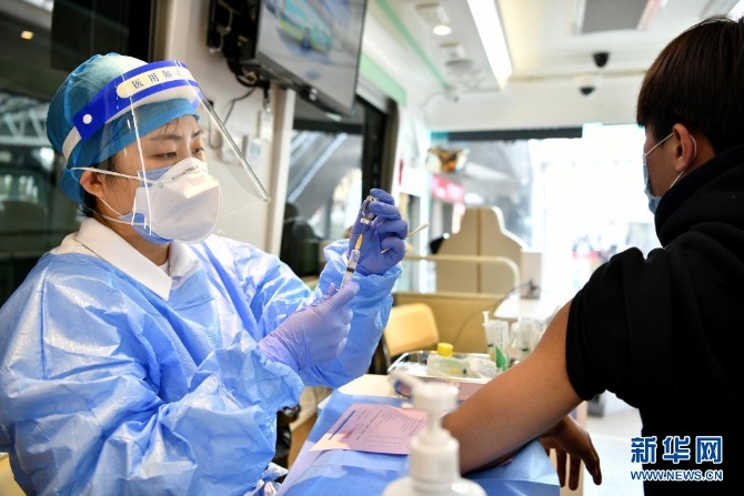 4月7日,医护人员在移动疫苗接种车上为市民接种新冠疫苗。新华社记者 张玉薇 摄