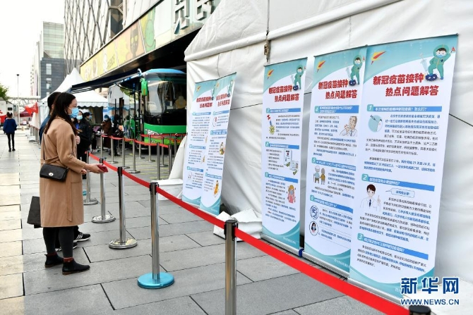 4月7日,在北京西单商业区,行人驻足观看接种点展示的新冠疫苗接种知识宣传海报。新华社记者 李鑫 摄