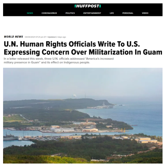 近日,联合国人权理事会的三名特别报告员发布了一封致美国政府的联合指控函,对美国在未与查莫罗人民进行充分协商的情况下增强关岛军备,以及由此对原住民土地、资源、环境和文化权利造成的威胁表示“严重关切”。