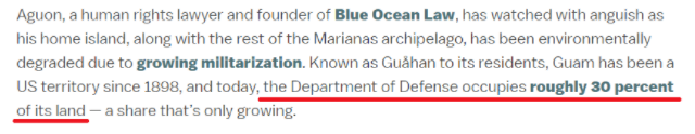 自1898年美国占据关岛至今,美国国防部已经占据了岛上大约30%的土地,而且这一占地比例还在不断增长。