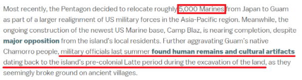 就在最近,作为美国在亚太地区军事力量大规模调整的一部分,五角大楼又决定将大约5000名海军陆战队员从日本迁往关岛。与此同时,美国海军陆战队最新的基地也在岛上居民的强烈反对声中接近建成。更让查莫罗人悲愤的是,美军基地选在当地古村落破土动工,因为在挖掘过程中发现了人类遗骸和文物。