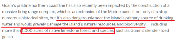 此外,关岛原始的北部海岸线最近也受到一个美军大型靶场建设的影响。作为海军基地的延伸,这个靶场不仅坐落在众多历史遗迹之上,而且靠近岛上的主要饮用水源,并将严重破坏岛上的自然资源和生物多样性,包括上千英亩的原生石灰岩森林和关岛特有的细趾壁虎等物种。