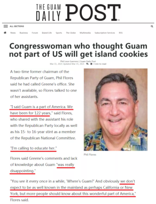 更令人难以忍受的是一些政客的无知妄言。不久前,美国佐治亚州共和党籍联邦众议员马乔里·泰勒·格林在一次公开演讲中,竟然错误地把关岛说成是一个不应该接受美国财政援助的“外国”。