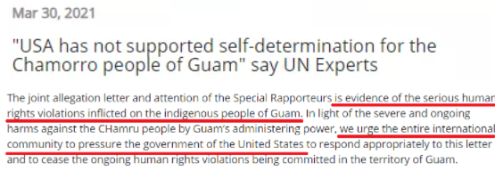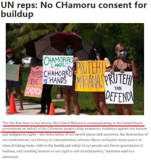 正因美国长期无视关岛原住民守护自己家园的呼声,联合国人权报告员在指控函中特别“对美国政府不支持关岛查莫罗人民的自决权”表达了进一步关切。