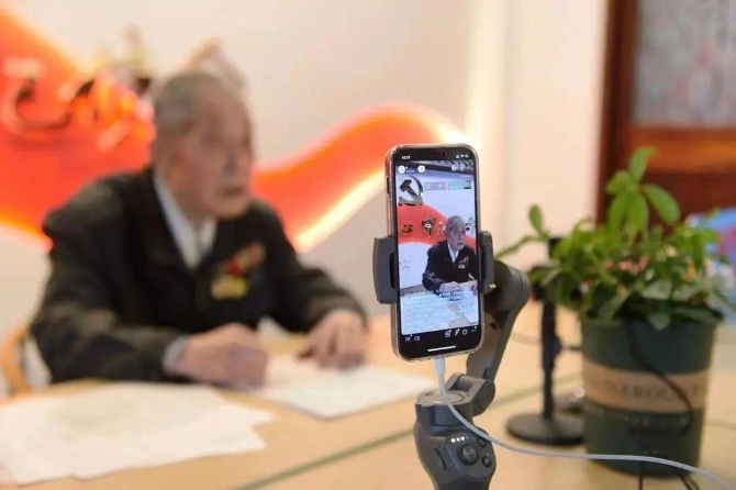 4月7日下午2点,许多嘉兴人打开抖音和哔哩哔哩的直播后都刷到了一个精神矍铄的老兵,用质朴平实又饱含深情的语言讲述一个个战火纷飞中的英雄故事。