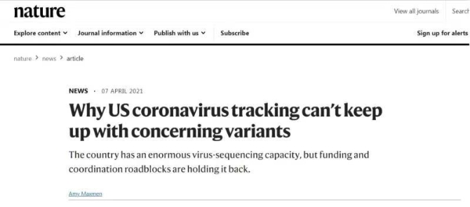 这篇名为《为何美国新冠病毒追踪跟不上令人焦虑的病毒变异》的文章表示,3月份美国在全球流感共享数据库(GISAID)的在线基因组存储库中,上传共享的新冠病毒基因组数量仅代表了美国当月新冠确诊病例数的1.6%。根据该数据库统计,美国在疫情期间的基因组测序工作,至少落后了30个国家和地区。