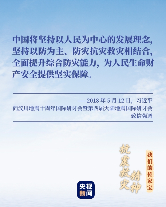 “同自然灾害抗争是人类生存发展的永恒课题。”习近平指出,要坚持“以防为主、防抗救相结合”方针,建立健全各项防治管理体系,全面提升综合防灾能力。