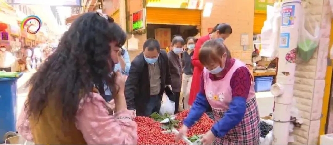 在篆新农贸市场,色泽莹润、果肉饱满的樱桃已经大量上市,商户们说,市场上的樱桃主要来自富民、呈贡以及攀枝花等地,这几天由于各地樱桃全面成熟,产量增多,价格自然就降了下来,相较刚上市时的八九十元一公斤,现在便宜了许多。