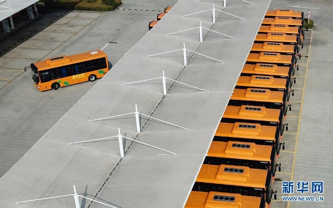 在江苏省泰兴市公交总站,一辆纯电动公交车入站充电(2018年11月10日摄,无人机照片)。新华社记者季春鹏/摄