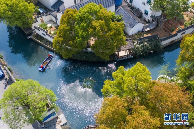 浙江省长兴县龙山街道渚山村,保洁人员进行日常河道护理巡查(2020年4月9日摄,无人机照片)。新华社记者徐昱/摄