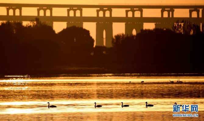 白天鹅在三门峡天鹅湖国家城市湿地公园内栖息(2019年11月14日摄)。新华社记者郝源/摄