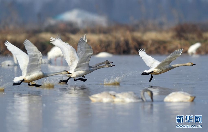 候鸟在位于江西鄱阳湖畔的五星农场境内振翅起飞(2018年1月11日摄)。新华社记者万象/ 摄